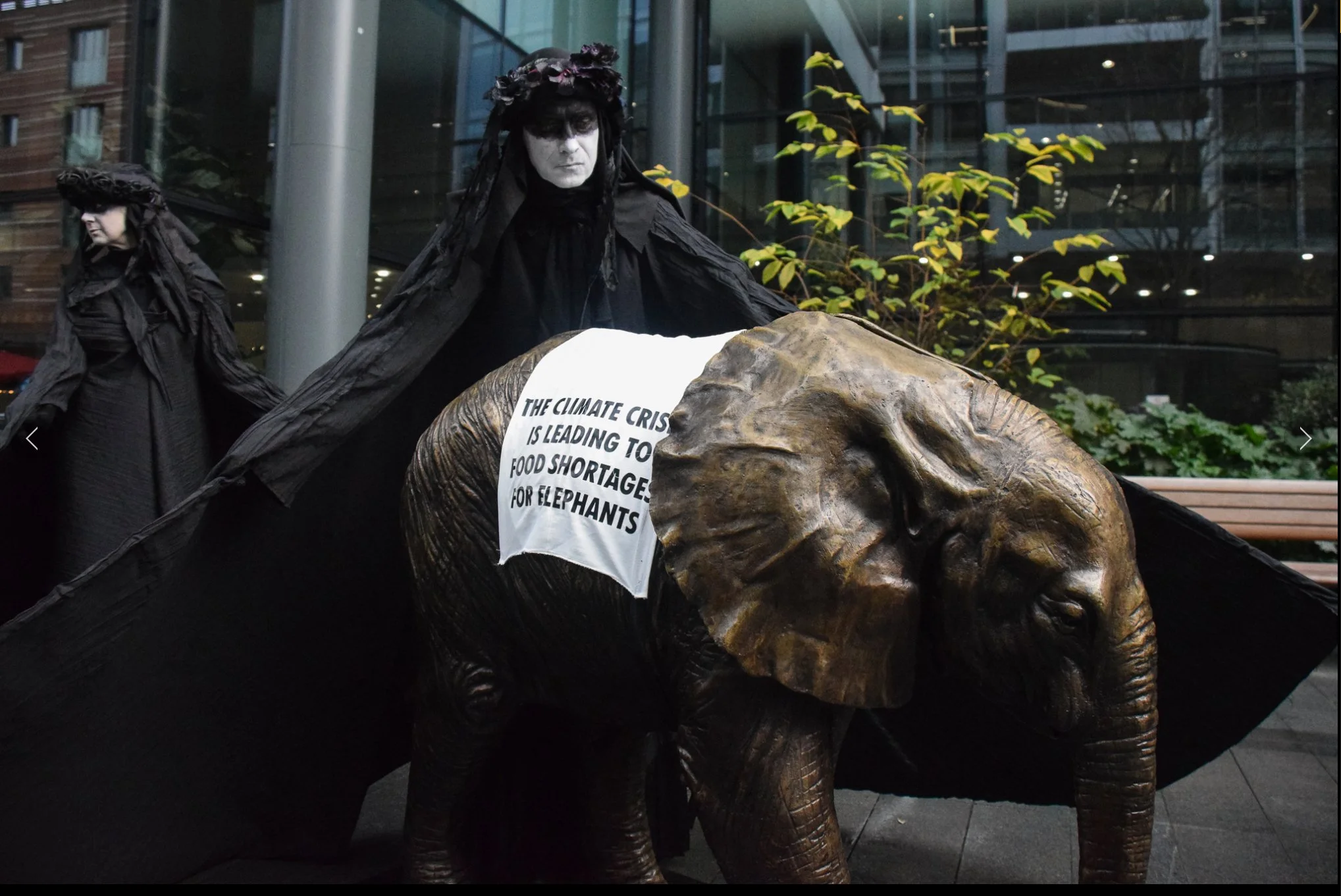 These were some coats that the chimps and their friends from the Cut The Ties to Fossil Fuels campaign put on the elephants in Spitalfields, just outside of A&O Shearman in November. They didn’t want the elephants to get cold. And it was a chance to tell A&O Shearman to stop working for fossil fuel companies!